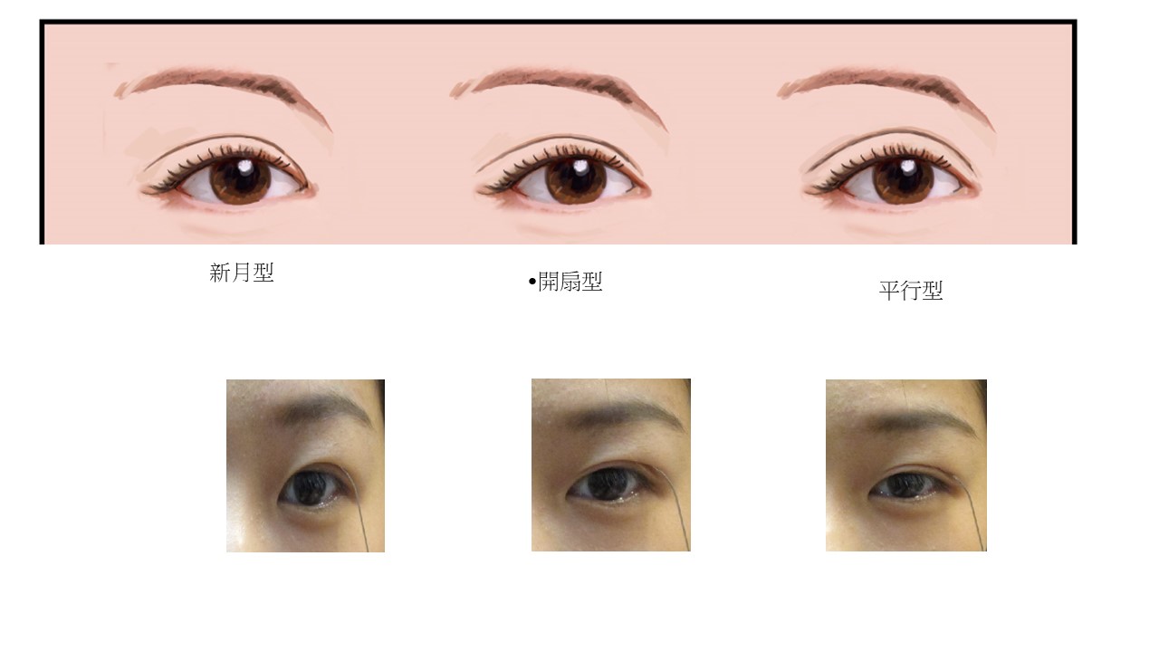 •開扇型:雙眼皮摺線自內眼角開始,由窄變寬,如同扇子展開,效果自然,是東方人最常見的雙眼皮形態之一。