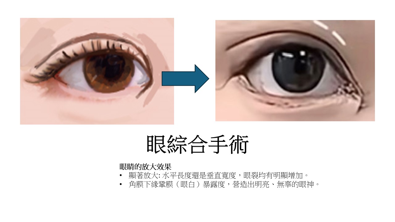 眼綜合手術並非單一手術,而是一個概念,是將多項眼部整形手術進行組合,以達到整體改善眼部外觀的目的。這種「多術式聯合」的策略,根據個人的眼部基礎條件、臉型特徵及個人期望,量身打造最優化的手術方案。根據手術項目的多寡,通常可分為「大眼綜合」與「小眼綜合」,讓五官更精緻,體現協調美。