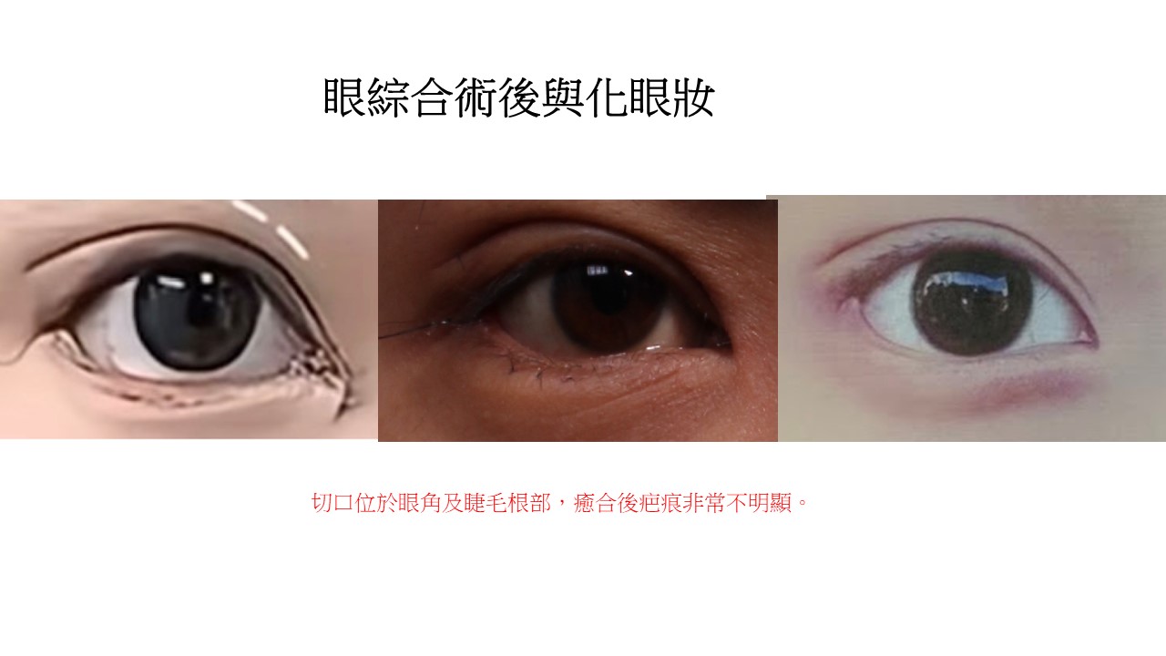 效果自然度與疤痕的隱蔽性:手術的切口設計精巧,完成結構調整與固定後,進行精細的皮膚與結膜縫合。縫合技術對於術後疤痕的隱蔽性至關重要。從術後恢復期,切口位於眼角及睫毛根部,癒合後疤痕非常不明顯。手術結束後,會對眼部進行簡單的包紮與冰敷,減輕腫脹與不適。外眼角切口隱藏在眼尾的自然皺褶中,下眼瞼調整幾乎無痕跡。在完全恢復後疤痕幾乎不可見,達到了以假亂真的自然效果。