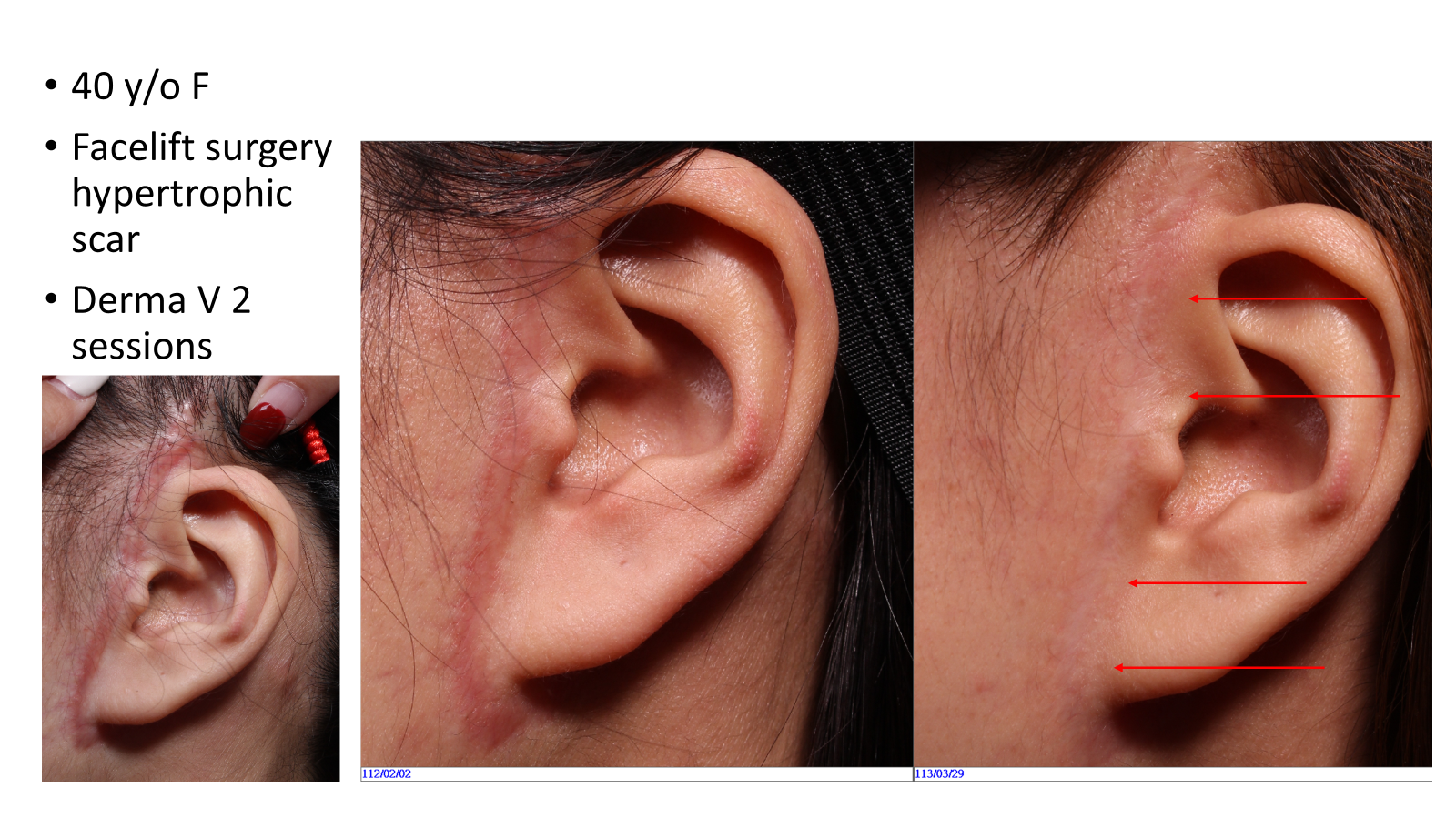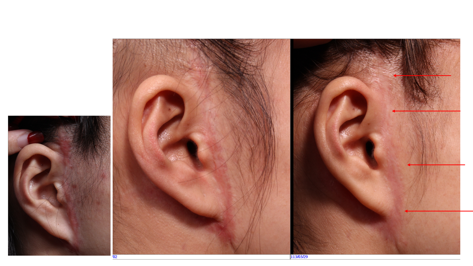 - 初期: 術後初期,切口會呈現紅色線條,這是正常的癒合過程,可以早期進行光電雷射介入。