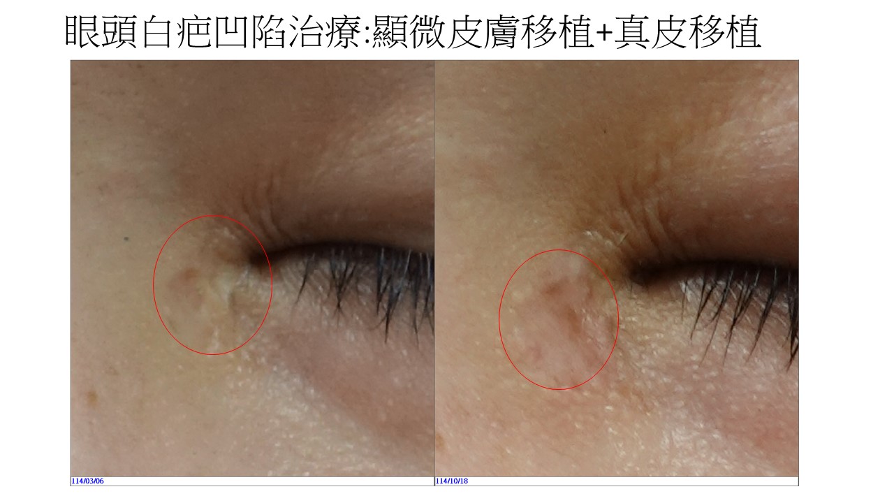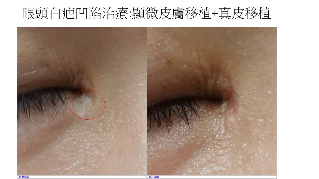 治療後效果(右圖,114/10/18):經過約7個月的治療與恢復期,疤痕區域的顏色已明顯改善,白色疤痕幾乎完全消失,與周圍皮膚的色澤趨於一致。凹陷的部分也獲得顯著填補,皮膚表面的平整度大幅提升。整體而言,眼頭區域恢復了自然的外觀,不再成為視覺焦點。