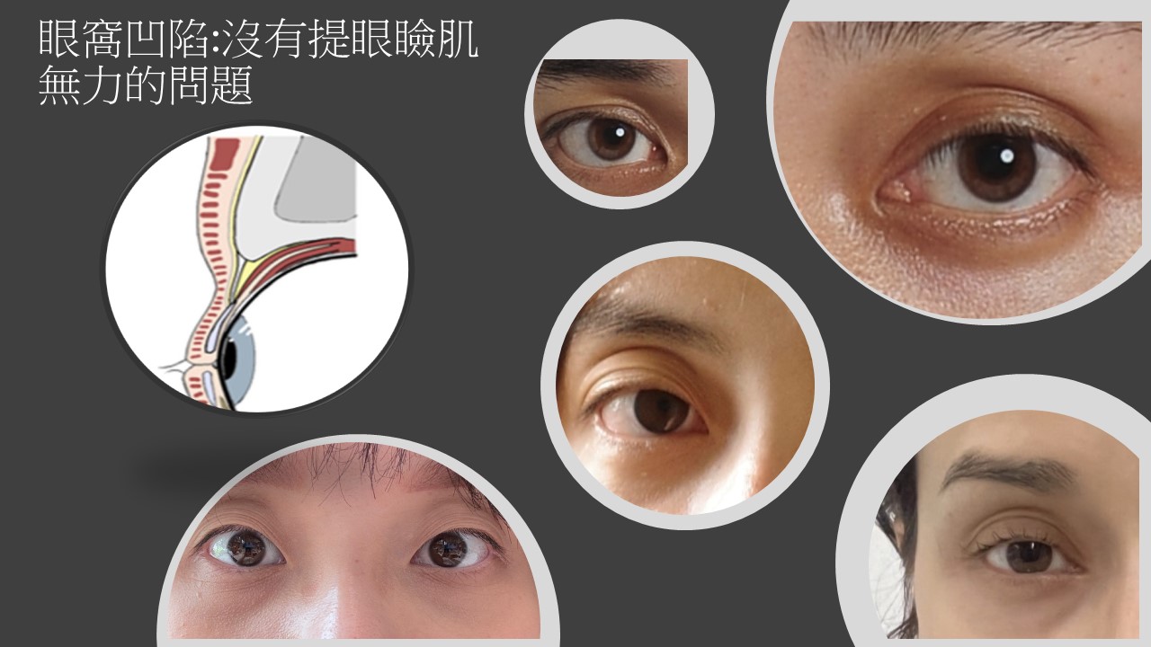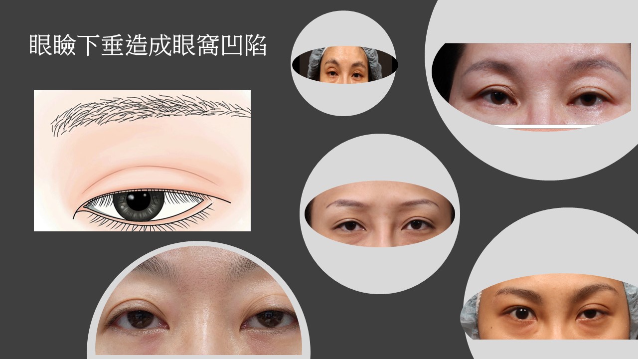 隨著面部老化,眼窩凹陷患者的雙眼皮寬度會逐年變寬。這是因為皮膚鬆弛導致摺痕落在凹陷處,進而遮蓋睫毛根部。醫師應確認患者是否具備皮膚到提上瞼肌腱膜的連續性。後天性雙眼皮常因皮膚變薄產生,且常伴隨眼瞼下垂與左右大小眼不對稱。